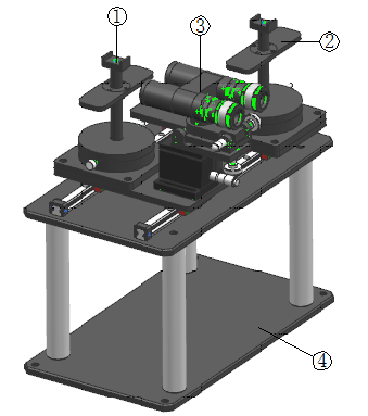 微光夜视固定支架1和2放置微光夜视仪,固定支架1和固定支架2可水平角度调节,固定支架1放置的微光夜视仪配合4倍双目前置镜使用,4倍双目前置镜可垂直升降、水平角度和俯仰角度调节,可满足不同的测试需求。